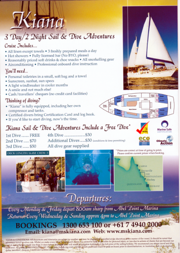 Kiana Kiana is a 60ft (16.5m) cutter rigged ketch that was launched in 1990. Purpose built as a charter sail and dive vessel no compromises were made in Kiana's design and fit out. Kiana's powerful diesel engine ensures you're never stranded if the wind should drop. On board Kiana, you will enjoy sailing around the 74 Whitsunday Islands and also get to scuba dive the Outer Great Barrier Reef in ma ...
