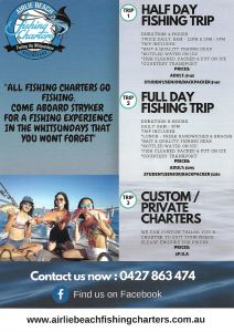 AIRLIE BEACH Fishing Charters Welcome to Airlie Beach Fishing Charters We are based in Airlie Beach the hub for the beautiful whitsunday Islands. These Islands lie between the North East coast of Queensland and the Great Barrier Reef. The Whitsunday Islands consist of 74 Islands, amongst others are the famous Hamilton Island,Daydream and Hayman Islands to name a few. Come aboard Airlie Beach Fishi ...