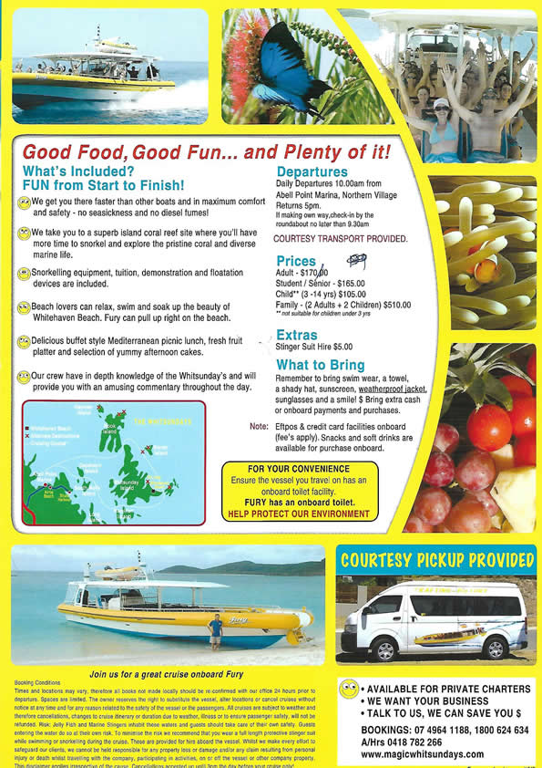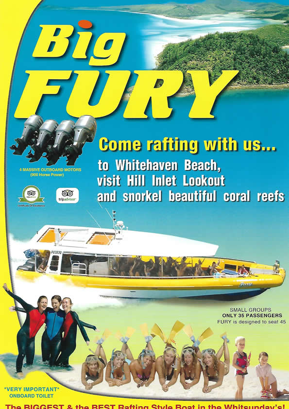 BIG FURY The Whitsunday Islands Fastest One Day Cruise All in ONE day…visit magnificent Whitehaven Beach and the Hill Inlet lookout, enjoy an Island Reef Snorkel at one of the many pristine coral reefs around the Whitsunday Islands and take a hike up to Solway Peak lookout, all onboard Big Fury – the "Ferrari" of day boats in the Whitsundays! Big Fury is a FUN-TASTIC BOAT!!A Fury Ride – "Get there before the crowds" Snorkel the best reef sites We take you to a superb island reef site where you will enjoy snorkelling amongst 1000s of tropical fish and beautiful corals in clear waters just minutes from the Islands. Snorkelling locations May consist of the following island reefs: Langford Reef, Blue Pearl Bay, Mantaray Bay, Luncheon Bay, Butterfly Bay or Border Island. Our crew selects the locations depending on weather conditions, endeavoring to get you to the best snorkelling site on the day. Guided Cruise of the Whitsunday Islands Our crew provide an informative and entertaining commentary about the many 'Picture Postcard Islands' we pass along the way! Whitehaven Beach is renowned as one of the Top 10 Beaches in the World No trip to the Whitsundays is complete without a visit to this 'beautiful piece of paradise'. Here you will have ample time to enjoy a swim in the crystal clear turquoise waters, feel the pure white silica sand through your toes on this 7km stretch of beach. Guided walk to Hill Inlet lookout Enjoy a short guided bushwalk to Hill Inlet lookout to view the famous swirling sands. Half the Fun is getting there and back! Fury cruises past more than 30 tropical islands which make up part of the Whitsunday Islands group… So sit back, enjoy the stunning natural scenery, catch a glimpse of a turtle, dolphin or even a hump back whale and our crew will inform you of the history behind this amazing area. Enjoy a Sumptious buffet style picnic Lunch Served right on Whitehaven Beach, consisting of – creamy potato salad, indian curry rice salad, tuna and veg pasta salad, Italian mixed salad, prawns, cold meats platter of silverside, premium chicken and roast beef, selection of fresh rolls, fresh fruit platter of pineapple, rock melon, watermelon and other seasonal tropical fruits. TOILET FACILITIES ONBOARD... Avoid any embarrassing moments!! FURY CAN PULL UP RIGHT ON THE BEACH... No need to be transferred by dingy, Fury's shallow draft allows her to pull up right on the beach. VERY COMFORTABLE SEATING and SHADED AREA'S THROUGHOUT... AIRLIE'S FINEST CREW... We have hand picked our crew from the most professional, informative and entertaining crew in the Whitsunday's. All of our guests comment on the jovial, laid back atmosphere onboard! Courtesy bus Transfers from/to Airlie Beach accommodation The Boat – BIG FURY… EXTREME COMFORT and SAFETY... Powered by 4 x 225hp motors, Fury is capable of speeds of more than 80km per hour. She combines the reliability and speed of an off-shore patrol boat.
