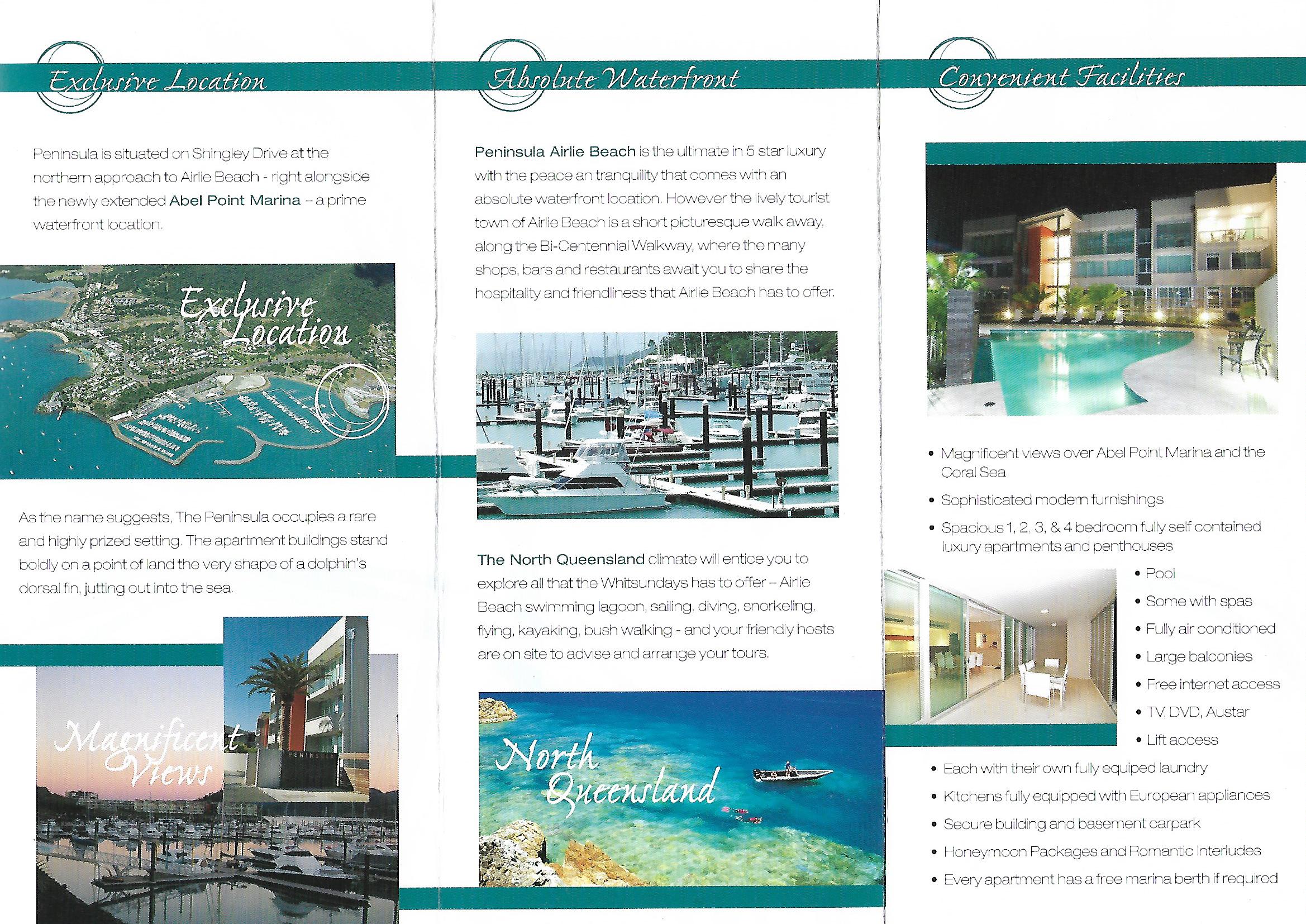 PENINSULA Stay and Sail Package Stay 4 nights including day tour with Camira for 2 adults – 1 bedroom apartment Normally $2160 NOW ONLY $1779 (2 persons) Experience the wonders of the Whitsundays on this full day cruise on board Camira – our big purple catamaran! Sail through the azure blue waters of the Whitsunday Islands, walk to Hill Inlet, snorkel the inner reef and enjoy a delicious BBQ lunch. This special excludes, Easter, Race week and Christmas & New Year Peak seasons. Luxury 5 Star Airlie Beach Accommodation Peninsula is Airlie Beach’s most luxurious and the only 5 star beachfront accommodation situated alongside the newly extended Abell Point Marina – a prime waterfront location. As the name suggests, Peninsula Airlie Beach occupies a rare and highly prized setting. The apartment buildings stand boldly on a point of land the very shape of a dolphin’s dorsal fin, jutting out into the Coral Sea. Airlie Beach the ideal base for those wishing to cruise the Whitsundays and the Great Barrier Reef without living aboard. 1 & 2 Bedroom Apartments Tasteful furnishings have been chosen to compliment the tropical lifestyle.All apartments feature a separate media area complete with DVD and LCD TV and sound system. Peninsula apartments have been designed to take full advantage of the tropical environment with the finest Euro appliances, wide balconies and large sliding glass doors to the internal living rooms and bedrooms. Some master bedrooms enjoy marina and sea views – speak with our management team when booking to confirm your preference. All bathrooms are equipped with quality fittings. Some have spas – speak with our management team when booking to confirm your preference. 3 Bedroom Apartments Tasteful furnishings have been chosen to compliment the tropical lifestyle.All apartments feature a separate media area complete with DVD and LCD TV and sound system. Peninsula apartments have been designed to take full advantage of the tropical environment with the finest Euro appliances, wide balconies and large sliding glass doors to the internal living rooms and bedrooms. Some master bedrooms enjoy marina and sea views – speak with our management team when booking to confirm your preference. All bathrooms are equipped with quality fittings. Some have spas – speak with our management team when booking to confirm your preference. 4 Bedroom Penthouse The penthouses are split level with the master bedroom and ensuite located on the upper level with panoramic views over the marina and islands. Surround yourself with 5 star luxury and sophistication. Each stunning apartment has open plan living that embraces the skyscape and the sea, spectacular living balconies, the finest Euro appliances and panoramic views. All master bedrooms enjoy
