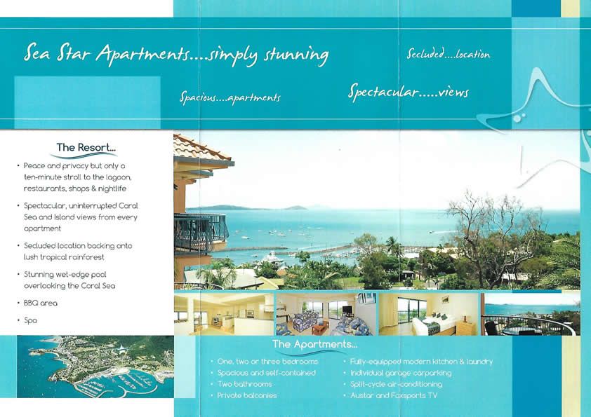 SEA STAR APARTMENTS Welcome to Sea Star Apartments in beautiful Airlie Beach. Our Airlie Beach accommodation is perfectly located with breathtaking island and ocean views from every terraced apartment. No need to stay in a cramped hotel room when you can enjoy our self contained apartments with large balconies, uninterrupted views of the Coral Sea, Hayman Island and Hook Island yet nestled close to Airlie Beach Village. Perfectly positioned to command unparalleled views of the 74 island Whitsunday Islands region, yet offering complete privacy, Sea Star Airlie Beach accommodation provides you with an irresistible tropical retreat. AIRLIE BEACH APARTMENTS OPTIONS Airlie Beach Apartments offers 1, 2 and 3 Bedroom self-contained apartments offering stunning Airlie Beach Accommodation in Queensland. We are sure that you will fall in love with our apartments, the perfect compliment for the perfect holiday. 1 Bedroom Airlie Beach Apartments Our one bedroom apartments have stunning views of the Coral Sea. With separate spacious lounge and dining areas and a full kitchen for the ultimate in convenience. It also has a separate laundry for your convenience. The main bedroom has a king / queen bed with massive walk in robe and ensuite. You also have magic views of the ocean from your bedroom! Enjoy easy in room entertainment with two televisions, cable TV and DVD player. We offer free in room wireless internet to stay connected during your getaway. Step outside onto your covered private balcony with stunning Ocean and Island views.