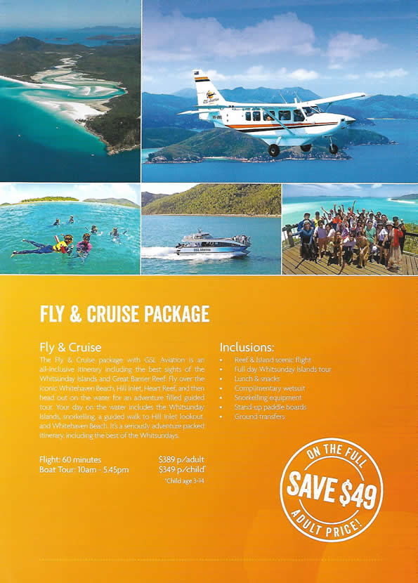 Reef and Island 60 minute scenic flight includes all of the iconic sights of the Whitsunday Islands and the Great Barrier Reef, one of the seven wonders of the world.The Reef and Island flight with GSL Aviation is the most comprehensive scenic flight in the Whitsundays, and one of the region’s signature experiences. The tour includes a comprehensive view of the regions best natural landscapes. Mainland river systems, Conway National Park, Whitsunday Islands, and the Great Barrier Reef are all part of your scenic adventure.While traveling with GSL, highlights of the flight include world famous Whitehaven Beach, and the swirling sands of Hill Inlet. Beyond the Whitsunday Islands, is the Great Barrier Reef, one of the seven natural wonders of the world. The unique colours and patterns of the reef are best appreciated from the air, including the iconic Heart Reef, which is only visible from the air, and only in theWhitsundays. The Reef and Island flight with GSL is a must-do in the Whitsundays! Inclusions: