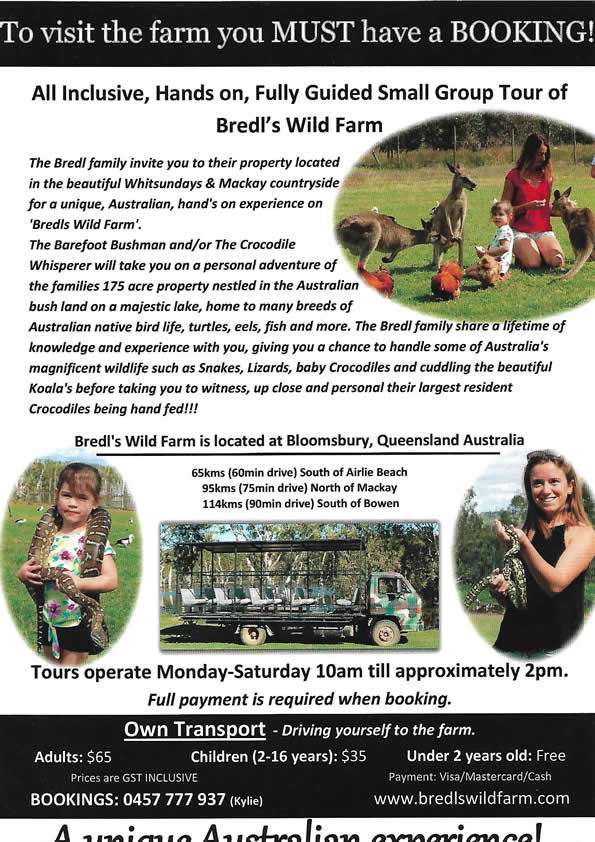 Bredl's Wild Farm is a guided tour and one of a kind, unique and personal experience, where you will have the opportunity to hold most of the animals, at no extra cost which includes snakes, baby crocodiles, lizards, koala and more (only children over 12 years old can hold the koala). They will take you down to the big crocodiles where they will hand feed them only metres from where you are standing which will AMAZE you. This will be a day out you'll remember forever.We only book a maximum of 34 people per day, the group will be split into 2 smaller groups, making it a very personal hands on experience. Full payment is required when booking. Minimum number 6 Adults are required for tour to run.Once you have booked and payment has been processed you will be emailed your receipt, booking confirmation and map to the property which is located at Bloomsbury Queensland approximately 1 hours drive from Airlie Beach or Mackay. We have a bus operating from Airlie Beach and will pick you up from your accommodation, for more information please contact us.The tour starts at 10am and runs till approximate 2pm. Tour's run Monday, Tuesday, Thursday, Friday, S